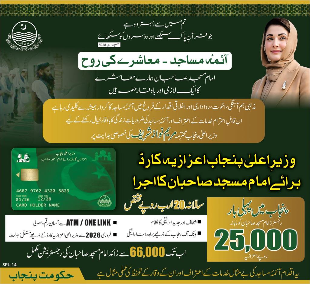 In a significant development aimed at supporting religious leaders across the province, the Government of Punjab has launched a groundbreaking initiative called the “Wazir-e-Aiala Punjab Aizazia Card” (Chief Minister Punjab Honorarium Card). This program is specifically designed for the Imams (prayer leaders) of mosques. Launched under the special directive of Chief Minister Punjab, Maryam Nawaz Sharif, this project recognizes the vital role Imams play in society. For the first time in the history of the province, a structured financial support system is being introduced to ensure the well-being and dignity…
