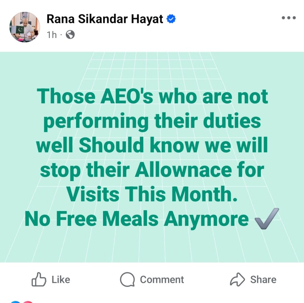 The message also includes a strong warning. It says that AEOs who are not performing their duties properly should understand that their monthly visit allowance will be stopped. The department pays this allowance for field visits and school monitoring. If someone is not doing their job, they will no longer receive this payment.