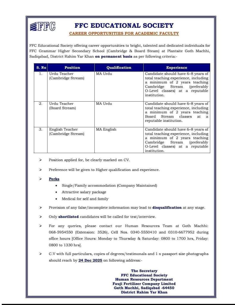 FFC Educational Society is offering great jobs for teachers. This is a good chance for MA degree holders. You can work as an Urdu or English teacher. The school offers free housing and medical care. Make sure you have the right experience before applying. Send your documents before 24 December 2025.