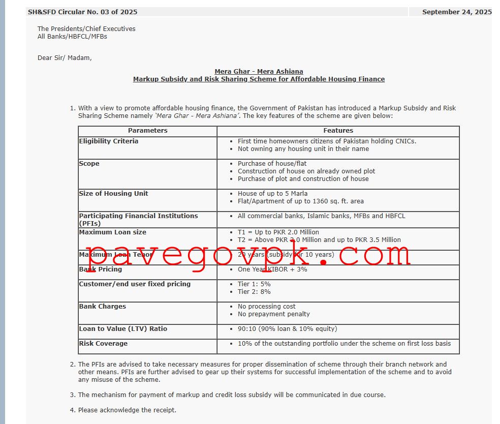 The State Bank of Pakistan (SBP) has introduced the Mera Ghar – Mera Ashiana Loan Scheme 2025 to help Pakistani citizens build or buy their own homes. This program is designed to promote affordable housing finance and provide support to people who do not already own a house. It offers a special markup subsidy and risk-sharing mechanism so that more families can have a safe and secure place to live. Check PM Electric Bike Scheme.